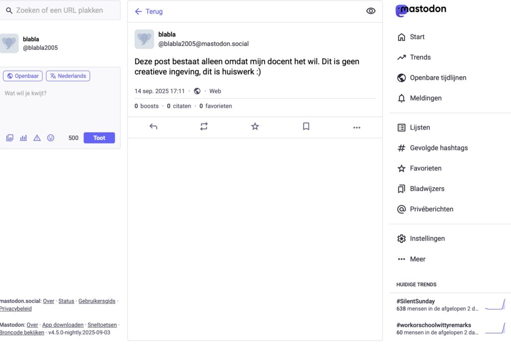 In dit blok heb ik me onder andere beziggehouden met het delen van digitale informatie en de impact daarvan op gebruikers en de gemeenschap. Een concreet voorbeeld hiervan is de Mastodon-post die ik heb geplaatst als onderdeel van de opdracht: het ging vooral om het actief gebruiken van een platform om informatie te publiceren. Hoewel de inhoud van de post zelf beperkt was, maakte het me bewust van hoe het praktisch werkt om iets online te delen en dat er altijd keuzes gemaakt moeten worden over hoe, waar en in welke vorm informatie beschikbaar wordt gesteld.